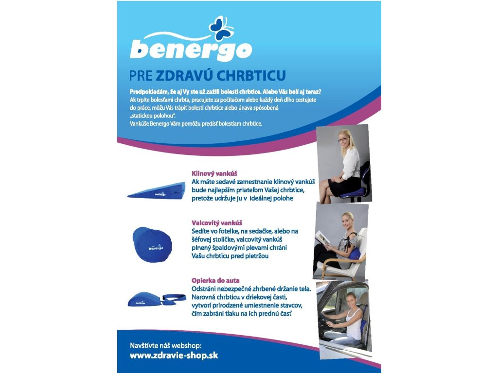 Použitie chrbticových vankúšov Benergo ponúka jednoduché riešenie ako predísť vzniku niektorých problémov s chrbticou, a zároveň tým tiež šetrí množstvo času, energie a peňazí, a čo je najdôležitejšie, bráni vzniku bolesti!
