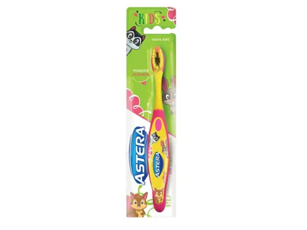 Zubní kartáček Astera Kids Extra Soft byl vytvořen speciálně pro nejmenší, obsahuje jemné štětiny, které jsou citlivé k dětským zubům a dásním. Mají aktivní úhel – šikmá vlákna mají různou výšku, čímž pomáhají vyčistit i těžko dostupná místa. Zubní kartáček má ergonomickou protiskluzovou rukojeť, pro pohodlné čištění zubů.
