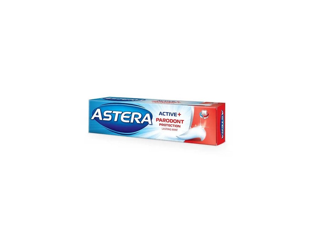 ASTERA ACTIVE+ PARODONT PROTECTION je zubní pasta s alantoinem, který chrání dásně před zánětem, a triclosanem, který potlačuje růst bakterií tvořících plak. Pasta příznivě působí na dásně a zabraňuje tvorbě plaku, který je příčinou zápachu z úst, zubního kamene a kazu. Pro celou rodinu!