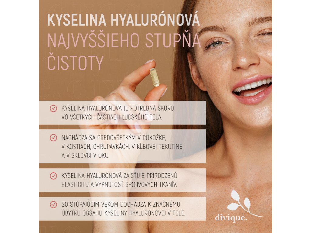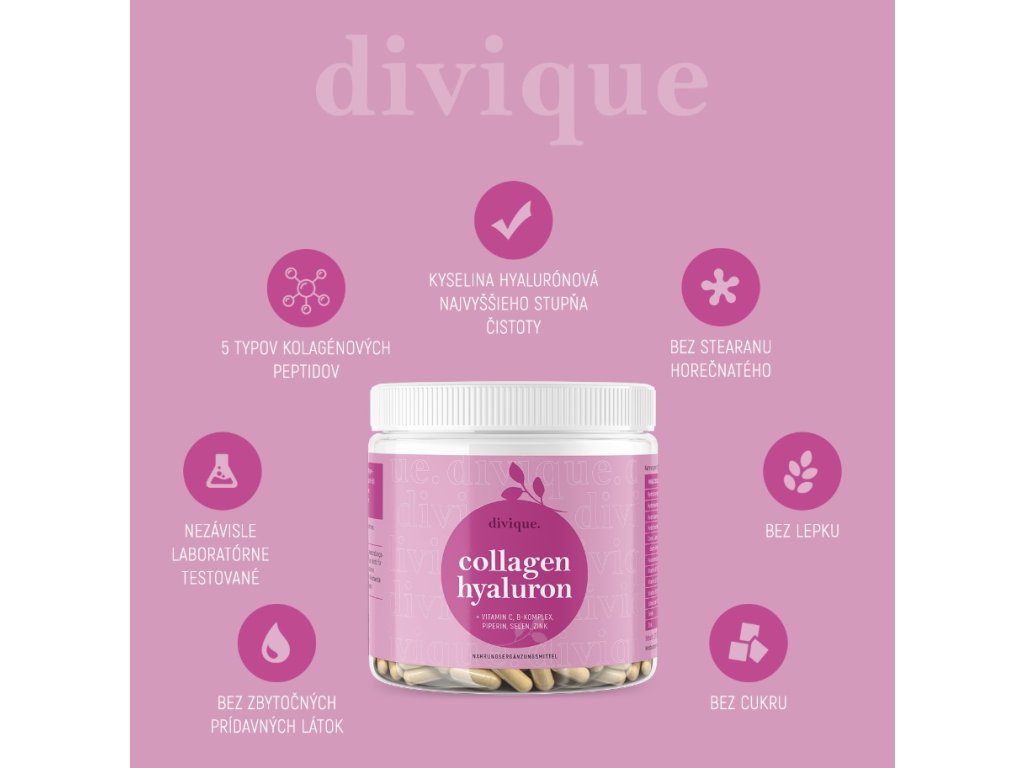 Důležitou složkou je kyselina hyaluronová, u níž bylo prokázáno, že vyhlazuje a hydratuje pokožku, což z ní činí nepostradatelný doplněk kolagenu. V kapslích Divique Collagen Hyaluron se nachází pouze kyselina hyaluronová nejvyšší kvality.