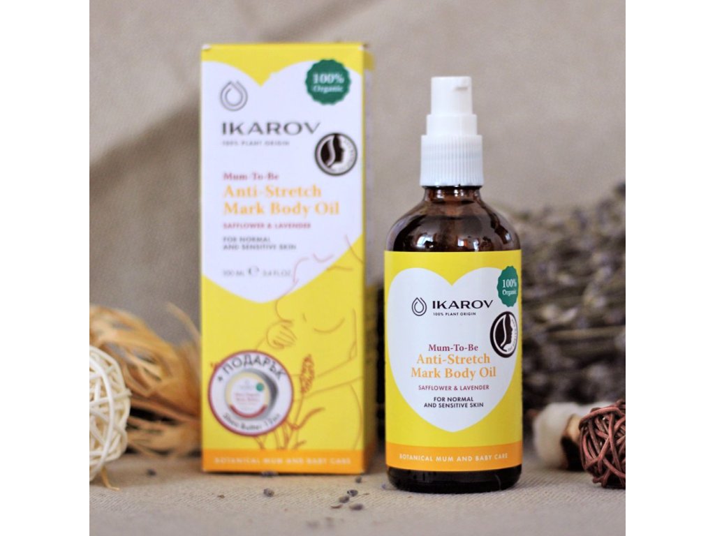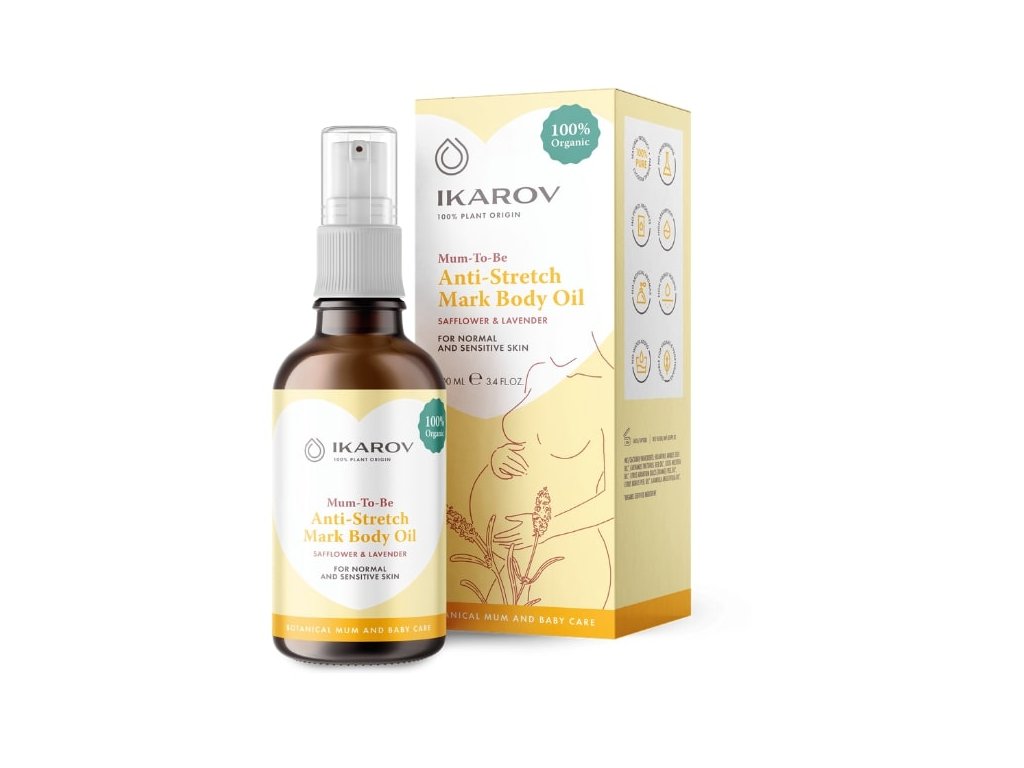 Tělový olej proti striím obsahuje 100% přírodní, organicky certifikované složky a je naprosto bezpečný pro matku i dítě.