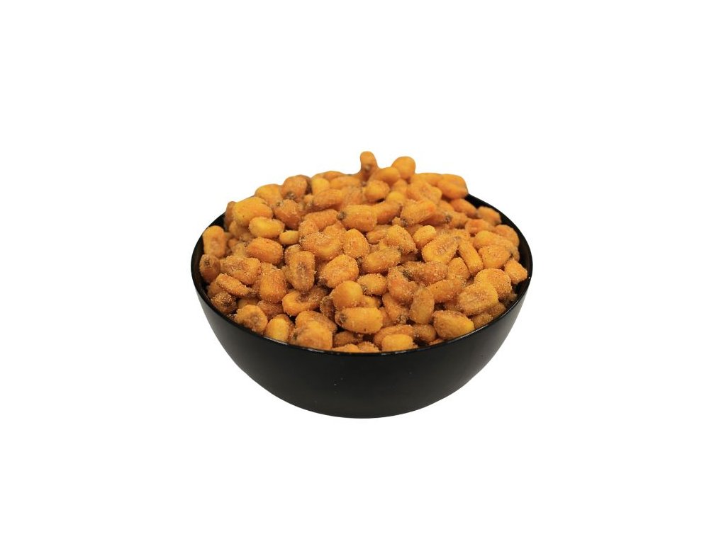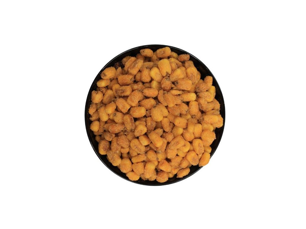 Dostatečně vysušené plody kukuřice žluto-hnědé barvy, které jsou posypány směsí koření s příchutí BBQ.