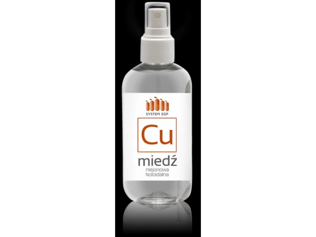 Cu - Koloidná meď System EGP je kvalitný nanokoloidný roztok s koncentráciou 50 ppm. Obsahuje veľmi malé častice medi suspendované v čistej demineralizovanej vode. Meď je dôležitou súčasťou ľudskej krvi a stimuluje enzýmy potrebné na tvorbu červených krviniek, čo pozitívne ovplyvňuje krvotvorný systém.
