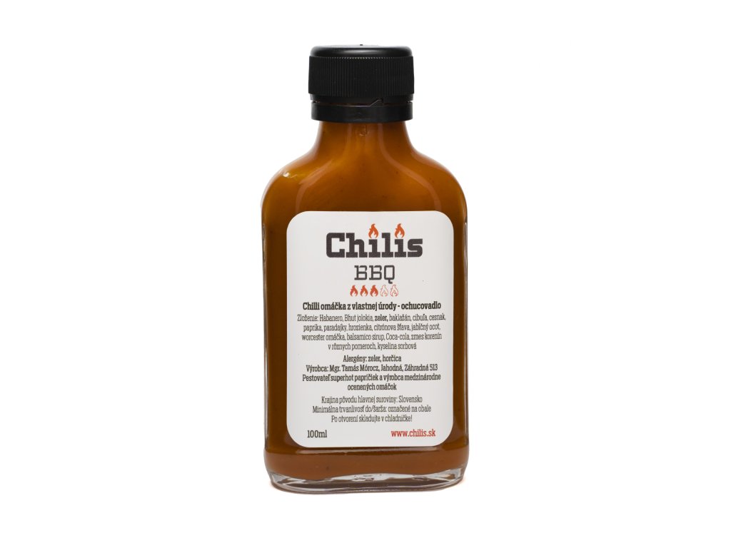 Chilis BBQ omáčka 100 ml je chuťovým manifestom skutočného grilovania.\nSpája grilovanú zeleninu, pražený baklažán, cesnak a cibuľu so silou Habanero Chocolate a Bhut Jolokia papričiek.\nO jemnú dymovosť sa stará kôrka domácej slaninky, ktorá dodáva omáčke nezameniteľnú nutkavú arómu pri varení.\n\nNa rozdiel od väčšiny komerčných omáčok nejde o sladký kečupový základ – toto je remeselné BBQ so skutočnou hĺbkou chuti.\nPálivosť nastupuje zarovno s chuťou, postupne sa rozvíja a zanecháva jemne horkastý dozvuk dymu a ovocia.\nDochuť podčiarkujú hrozienka, balsamico sirup a Coca‑Cola, ktoré jemne zjednocujú všetky tóny tejto unikátnej omáčky.\n\nSkvelá na potieranie mäsa pri grilovaní, na marinovanie, dipovanie alebo ako tajný ingredient do pečených rebierok či burgerov.\nAk miluješ pocit tepla, dymu a ohňa v jednom, toto je tvoja BBQ voľba.\n\n\n\n