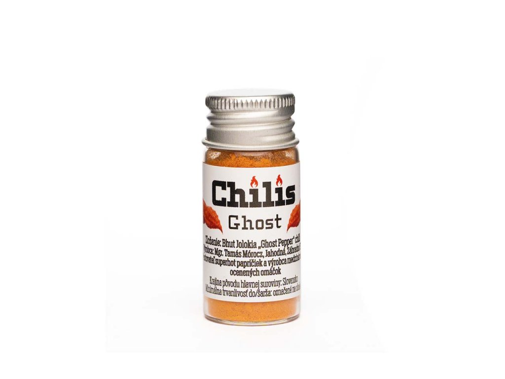 \nIkonické chilli pre skutočných fanúšikov extrémnej pálivosti. Vyrobené z paprík Bhut Jolokia (Ghost Chili), ktoré boli v roku 2007 zapísané do Guinnessovej knihy rekordov ako najštipľavejšie chilli na svete s hodnotou viac ako 1 000 000 Scovillových jednotiek (SHU).\n\nPrirodzená chuť kombinuje ovocnú arómu manga, jemné kyselkavé tóny a dlhotrvajúce teplo, ktoré sa rozvíja postupne a zostáva v ústach niekoľko minút. Je vhodné na dochucovanie mäsových jedál, polievok, omáčok, salsy, indických kari jedál a pálivých marinád – stačí naozaj malé množstvo!\n\nKaždé balenie obsahuje čisto mleté chilli z vlastnej úrody, bez konzervantov, soli a umelých farbív. Vďaka jemnej štruktúre sa rýchlo rozpúšťa a uvoľňuje plné arómy.\n\n\n\n🌶️ Zloženie a pôvod paprík\n\nBhut Jolokia pochádza z indicko-pakistanského regiónu Assam, kde bola dlhé roky používaná v domácej kuchyni aj na odpudzovanie divých slonov 😉. Papričky sú 5 – 8,5 cm dlhé, červené, so silnou ovocnou vôňou a neskutočne intenzívnou pikantnosťou (cez 1 000 000 SHU). Ich chuť vyniká v kombinácii so sladkými alebo exotickými jedlami, napr. s čokoládou alebo mangom.\n\n