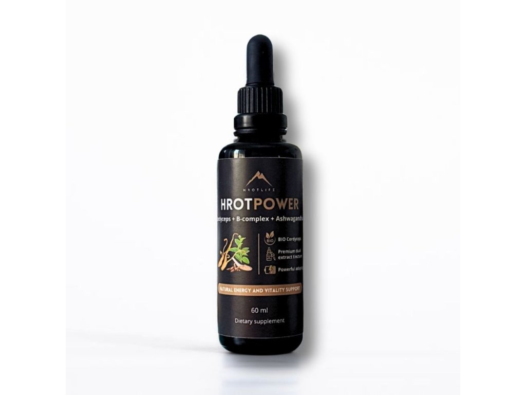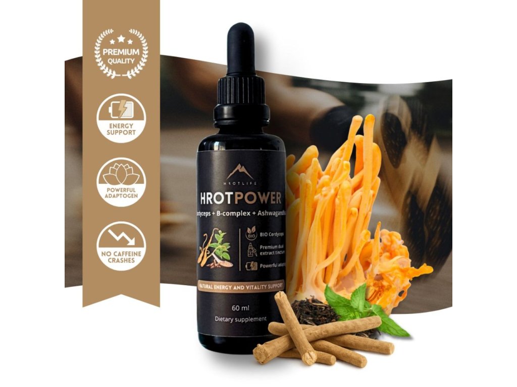 Hrotlife HrotPower je najnovšia generácia prírodných doplnkov, ktorý kombinuje silu huby Cordyceps s kompletným spektrum vitamínov B, Ashwagandhy a prírodného kofeínu zo zeleného čaju pre komplexnú podporu energie, výdrže a vitality bez náhlych poklesov.