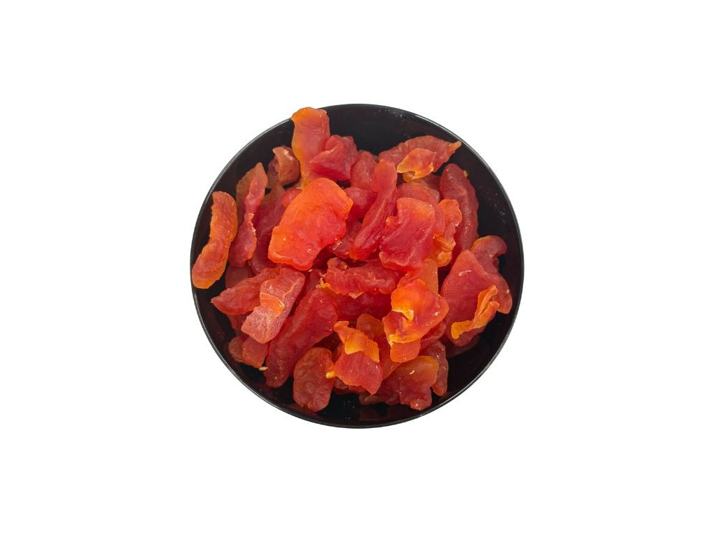 Sušená papája bez oxidu siričitého (SO2) je chutná a zdravá alternatíva bežných sladkostí. Ide o starostlivo spracované plátky papáje s prídavkom fruktózy, ktoré si zachovávajú svoju prirodzenú sladkosť, výraznú ovocnú chuť a príťažlivú oranžovo-červenú farbu. Vďaka šetrnému sušeniu bez chemickej konzervácie si produkt uchováva prirodzenú vôňu a chuť tropického ovocia.