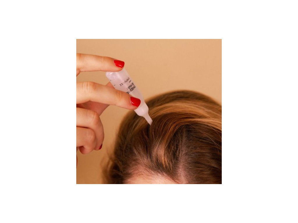 Pri prvom použití ampulky stlačte uzáver, aby ste prepichli trysku. Po otvorení („kliknutie“) odstráňte uzáver jeho potiahnutím. Pomocou dávkovača naneste 6-8 paralelných línií od čela po zátylok. Jemne masírujte končekmi prstov 2 minúty a neoplachujte. Učešte si vlasy ako obvykle a nechajte pôsobiť cez noc.